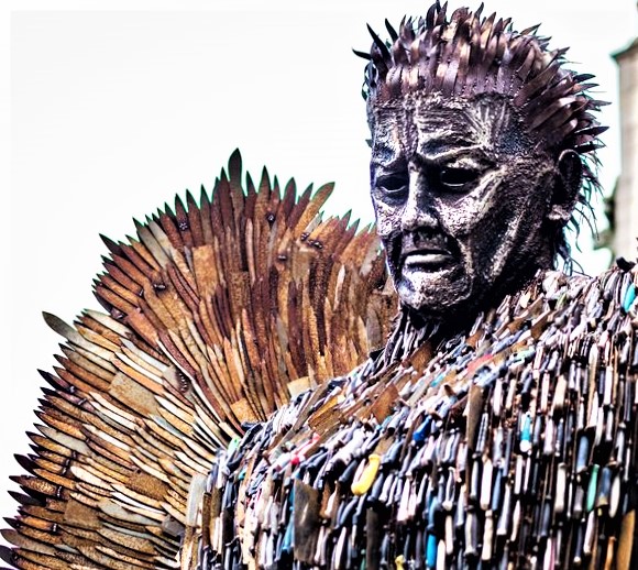 Monilla Britannian paikkakunnilla on viime vuosina vieraillut hämmästyttävä ja pelottavakin teräsveistos, jonka on tarkoituskin hätkähdyttää. Kyseessä on vuonna 2018 valmistunut, kaikkiaan 100’000 veitsestä hitsaamalla koottu, korkeudeltaan 8.2-metrinen veistos. Knife Angel (Veitsienkeli) -nimellä tunnettavan teoksen oikea nimi on The National Monument Against Violence & Aggression. Teokseen hankittiin veitsiä kansalaisilta tiedotusvälineissä esitetyllä kyselyllä /vetoomuksella, ja osa veitsistä kerättiin Britannian 43 poliisipiirin varastoista. Poliisin takavarikoimat, rikoksissa käytetyt veitset olivat autenttisia pahanteon välineitä, joista monissa oli vielä uhrien vertakin.