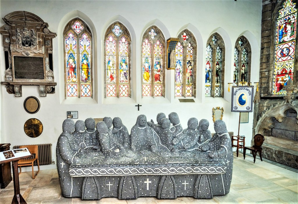 Renessanssiajan kuuluisimman taiteilijan, myös monipuolisena tiedemiehenä ja nerona tunnettavan Leonardo da Vincin (1452–1519) maalaus Viimeinen ehtoollinen on saanut modernin – ja mitä modernimmasta materiaalista tehdyn – veistosmuodon. Taiteilija Peter Barnes muovasi Jeesuksen ja 12 opetuslasta romutettujen tietokoneiden kirjain- ja numeronäppäimistä, joita teoksen mosaiikkiin tarvittiin yli 50’000.