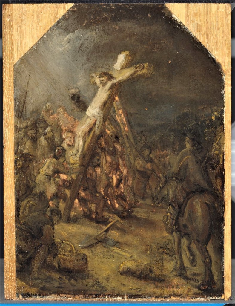 Tämä puulle maalattu teos on lähes yhtenevä Rembrandtin vuonna 1633 maalaaman, raamatullisen Ristin nostaminen (The Raising of the Cross) -taulun kanssa. Puupaneelin dendrokronologinen ajoitus kuitenkin osoitti, että puu on vuodelta 1634, ja maalauksen pohjaksi sitä on käytetty vasta 1640-luvulla, joten tämä pienikokoinen teos ei voi olla Rembrandtin luonnos tai suunnitelma suuren työn valmisteluvaiheesta. Maalauksen ajankohtaa tai syytä sen tekemisen ei voida kuin arvailla.