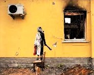 Tuntemattomana pysyttelevä, maailman tunnetuimmaksi katutaiteilijaksi luonnehdittu Banksy maalasi marraskuun alkupuolella 2022 seitsemän muraalia ukrainalaissa kaupungeissa sijaitseviin, Venäjän pommituksissa tuhoutuneisiin rakennuksiin (1). Muraaleista tuli niin ukrainalaisille kuin koko maailmalle väkivallan vastustamisen symboleja, mutta inhimillinen ahneus osoittautui täälläkin olevan aatteita voimakkaampi. Joulukuun 2. päivänä pääkaupunki Kiovan lähellä sijaitsevan Hostomelin kaupungin poliisi sai puhelun, että ryhmä miehiä yrittää irrottaa rauniotalon seinässä olevaa maalausta. Muraaliin on kuvattu kylpytakkiin pukeutunut, kaasunaamari kasvoillaan oleva nainen, jolla on kädessään sammutin (2), (3).